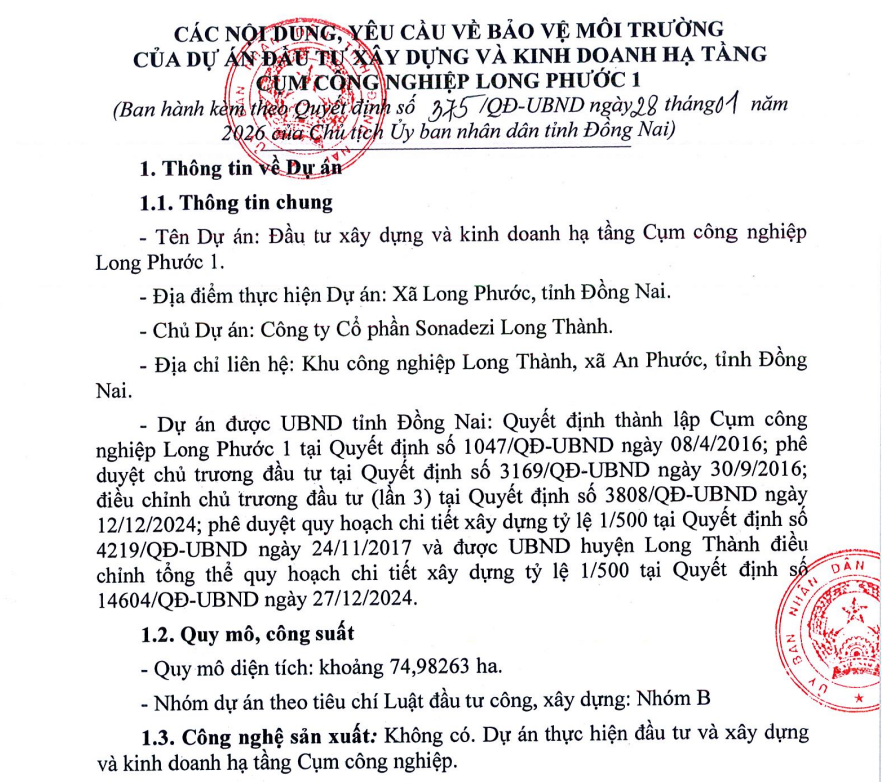 Ngày 28/1, Chủ tịch UBND tỉnh Đồng Nai đã ký Quyết định số 375/QĐ-UBND phê duyệt kết quả thẩm định Báo cáo đánh giá tác động môi trường đối với dự án đầu tư xây dựng và kinh doanh hạ tầng Cụm công nghiệp Long Phước 1, do Công ty Cổ phần Sonadezi Long Thành làm chủ đầu tư. Dự án tọa lạc tại xã Long Phước, huyện Long Thành, khu vực đang là tâm điểm quy hoạch hạ tầng, sân bay và cụm công nghiệp của thị trường bất động sản Đồng Nai.
